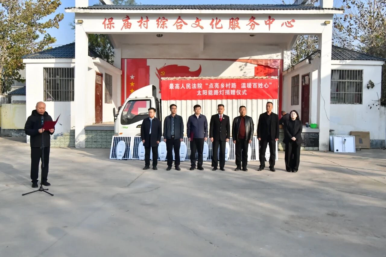 社会焦点与法.讯 记者:燕建设 通讯员: 王拥军 杨红治 周长志 王保庆 朱启艳 11月5日,最高人民法院为河南省商丘市睢县法院定点帮扶联系村凤城街道保庙村捐赠太阳能路灯。最高人民法院派驻睢县挂职副县长张政亮,睢县法院党组书记、代院长刘一宇,睢县法院驻保庙村工作队,凤城街道、保庙村干部等参加捐赠仪式。