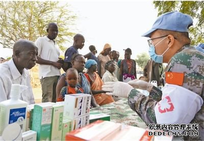 日前,中国第六批赴南苏丹(朱巴)维和步兵营医护人员为驻地民众进行卫生防病和疫情防控宣讲。图为医护人员在附近的皇后村开设临时巡诊点、发放常用药品。 |