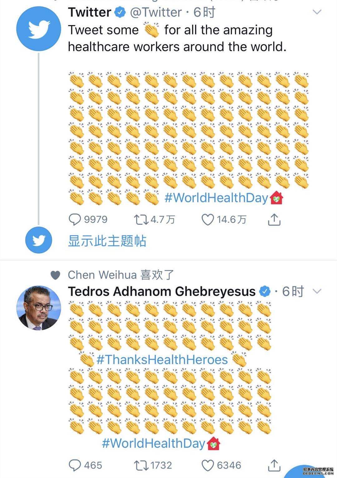 4月7日是世界卫生日。世卫组织总干事谭德塞在推特上贴出了一张图片,由数十个鼓掌的表情组成,向卫生系统的英雄们致敬。随后,推特官方(Twitter)呼吁用户发推,为全球所有了不起的医护工作者鼓掌。