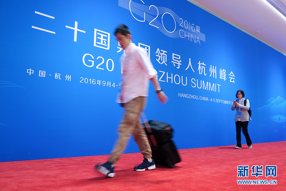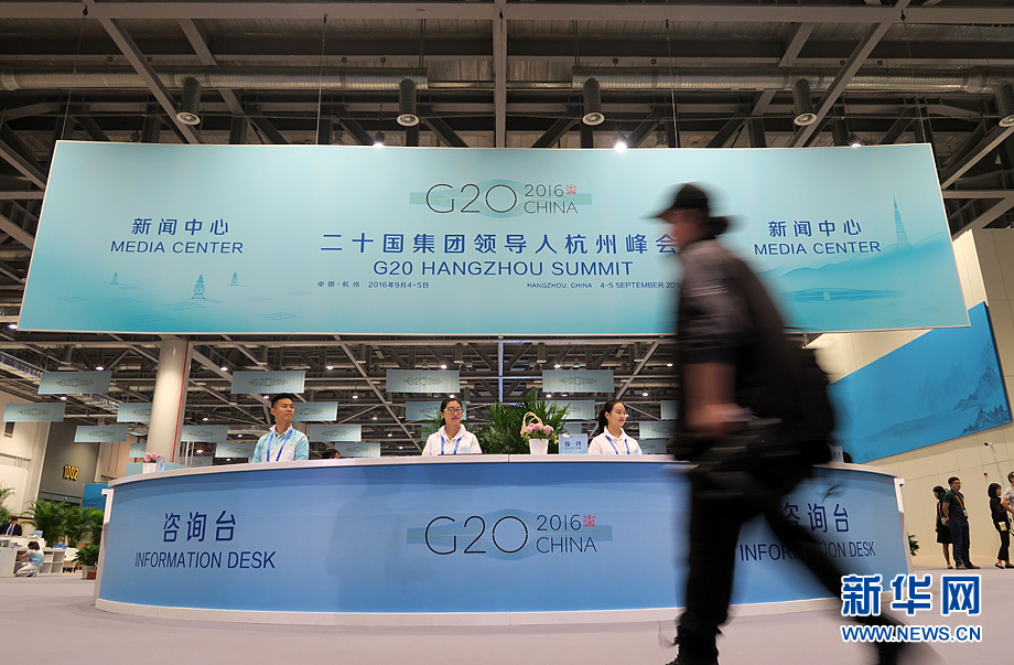 9月4日上午,金砖国家领导人非正式会晤在浙江杭州举行。当日,G20峰会新闻中心一派繁忙景象。新华网记者 陈竞超 摄