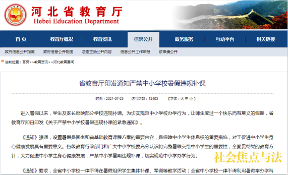 7月23日,河北省教育厅印发《关于严禁中小学校暑期违规补课的紧急通知》明确指出,全省中小学校一律不得在暑假组织学生集体补课、军训等教学活动;全省中小学校一律不得利用暑假举办学科培训班、特长班、奥赛班、兴趣班、提高班等;全省中小学校一律不得将校园、校舍出租给其它教育机构举办各类培训班。