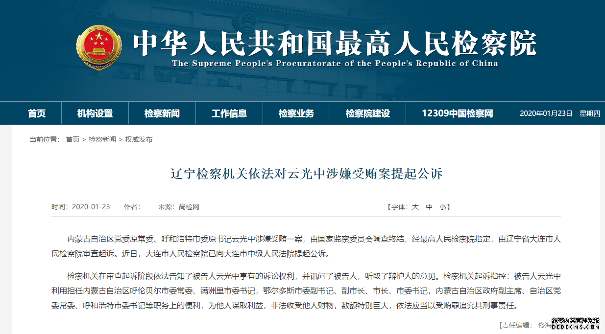 人民网北京1月23日电 据最高人民检察院官网发布,内蒙古自治区党委原常委、呼和浩特市委原书记云光中涉嫌受贿一案,由国家监察委员会调查终结,经最高人民检察院指定,由辽宁省大连市人民检察院审查起诉。近日,大连市人民检察院已向大连市中级人民法院提起公诉。