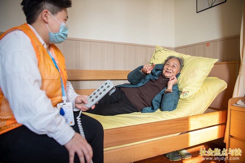 2021年12月2日,在重庆市渝北区仙桃街道养老服务中心,陈佩兰老人(右)在护理员陈傲的帮助下体验使用“智能护理床”。