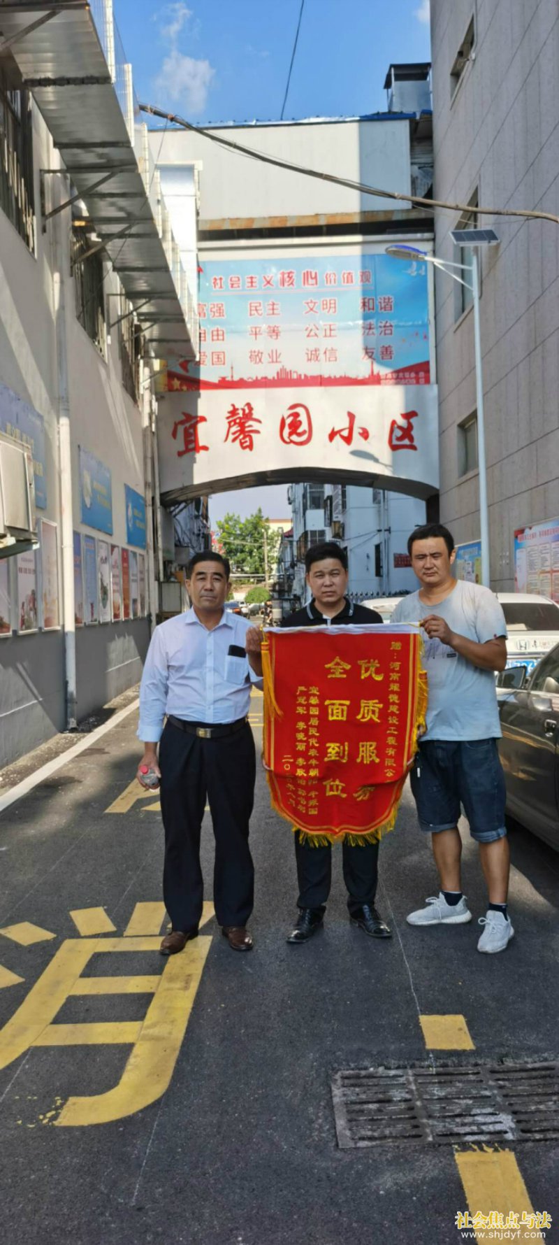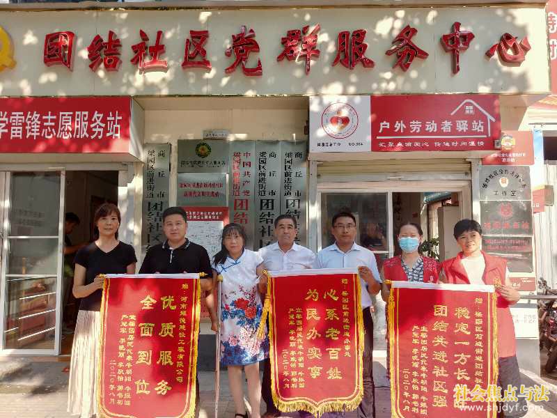 社会焦点与法.讯(通讯员:梁绘芳 王红霞 刘柱)2020年8月18日宜馨园小区居民代表为表达对办事处领导,社区工作人员及施工方的感激之情,把三面锦旗送到了团结社区,