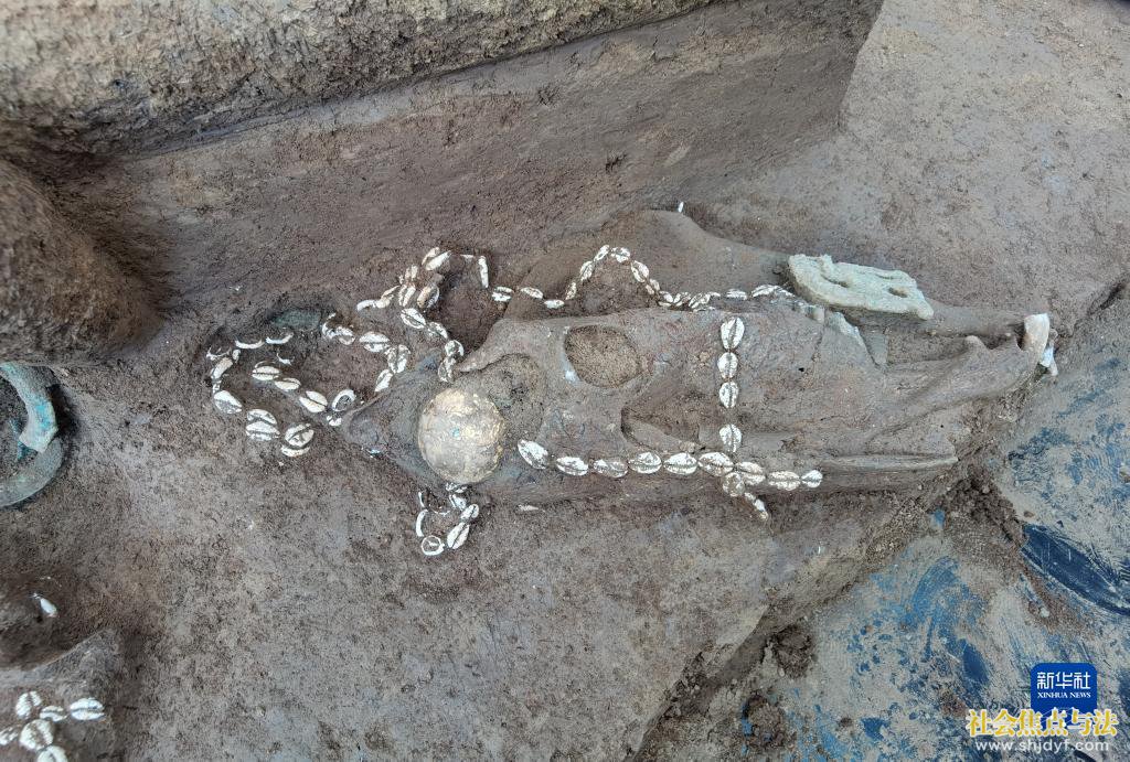 邵家棚遗址车马坑中,有的殉马头上有贝壳串饰,并有青铜衬底、黄金贴面的泡饰挂在马的前额处(资料照片)。新华社发(安阳市文物考古研究所供图)
