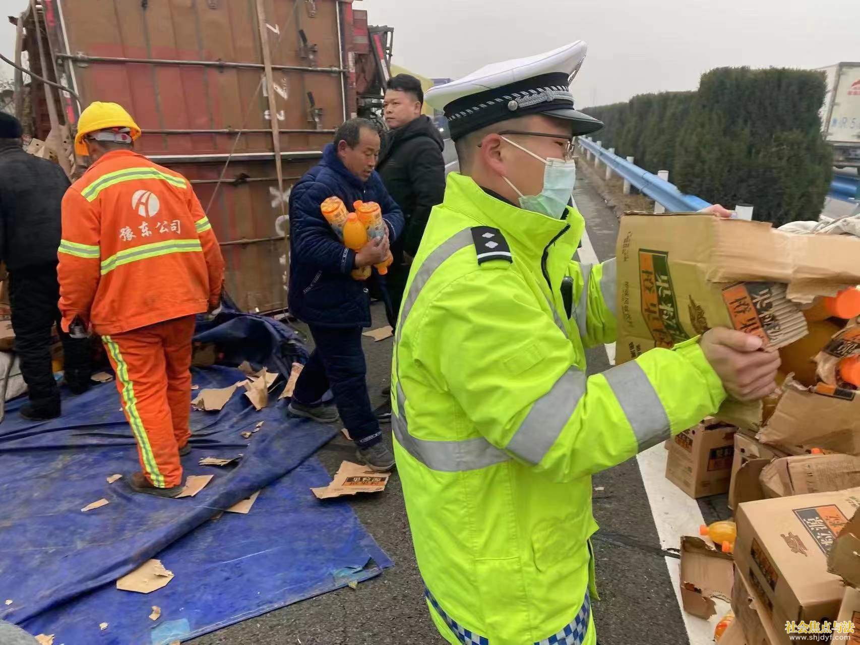 接警后,八中队副中队长王浩楠带领中队队员火速赶赴现场,同时通知路政及救援车辆前来增援。民警到达现场后发现,民警看到翻到在路面上,到处滚满了饮料,如果不及时处置,存在着较大的交通隐患。此时,过往车流滚滚,饮料散落的到处都是,司机只要稍有不慎,极易发生二次事故。如何将这么多的饮料短时间内收集转运,减少车主的损失,快速恢复通行,迫在眉睫。民警当即安排巡逻车辆在后方做好警戒,对现场进行处置,避免二次事故的发生。