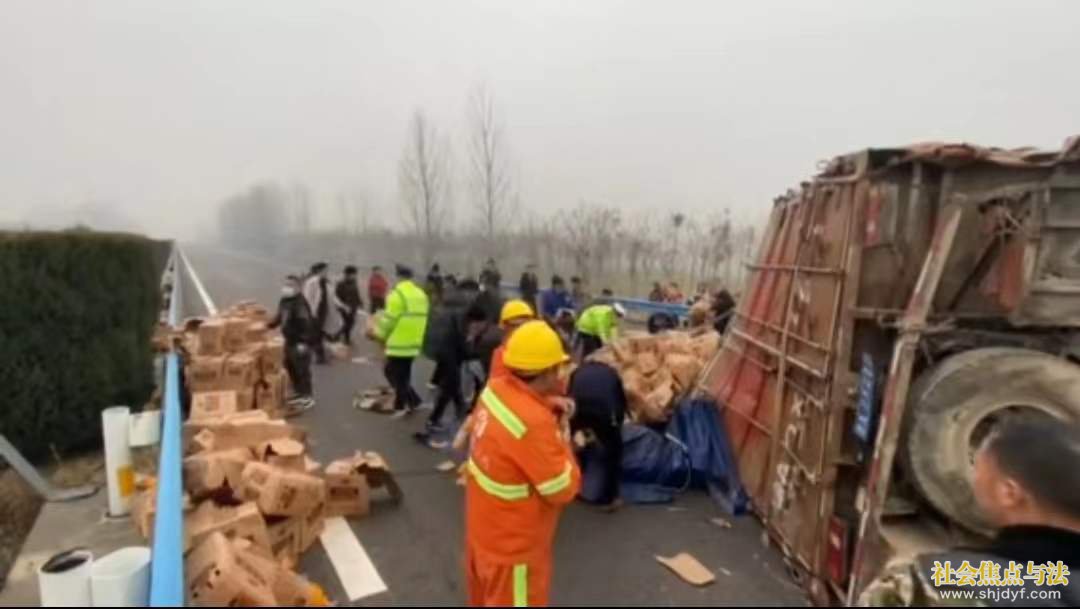 社会焦点与法.讯 记者:燕建设 通讯员: 刘利峄 马迎军 谢中彦 梁国杰 2023年1月17日14时许,商丘市公安局交警支队高速大队八中队接到报警电话成,盐洛高速公路478KM南半幅发生一起小型货车侧翻的交通事故,所拉载的一车饮料倾撒在路面上,占据部分超车道和行车道,所幸无人员受伤。