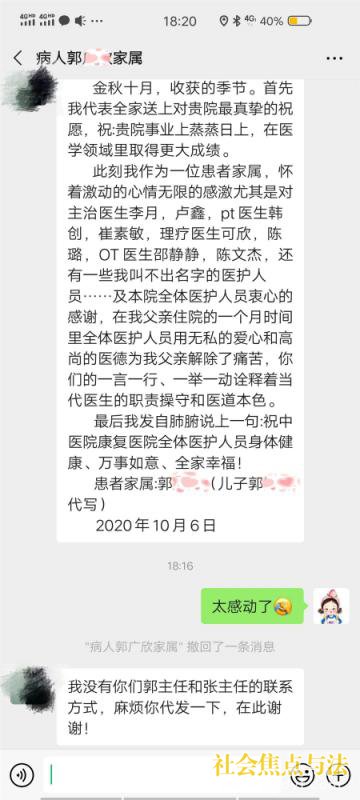 出院之前,郭某的儿子给李玥医师发了感谢红包,被拒收之后又在微信上写下了感谢信,康复院区每一位治疗师的名字都被患者记在了心中。两个月的治疗,让一位患者回归生活,让一个家庭受益,让一个顶梁柱重新开始新生活,这就是康复的意义所在。