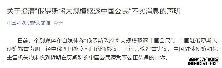 人民网北京4月8日电 据中国驻俄罗斯大使馆官方微信公众号消息,日前,个别媒体和自媒体称“俄罗斯政府将大规模驱逐中国公民”。中国驻俄罗斯大使馆郑重声明,经中俄两国外交部门沟通核实,上述言论严重失实。中国驻俄使馆和俄主管机关均未收到近期在莫斯科的中国公民遭受不公正待遇的申诉。