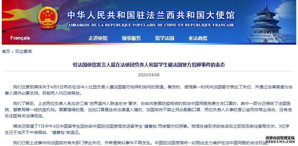 人民网北京4月8日电 据中国驻法国大使馆网站消息,驻法国使馆发言人就在法侨团负责人和留学生被法国警方扣押事件表态,全文如下:
